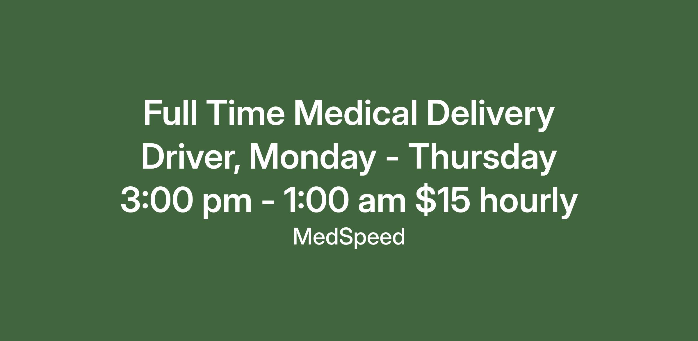 Come join MedSpeed to help us deliver health! MedSpeed is a healthcare logistics company that partners with healthcare organizations throughout your communities to transport a wide range of medical supplies, specimens, and materials. At Medspeed we work as a team, keep our promises and strive to get better every day. We are looking for individuals who believe in and represent those values.