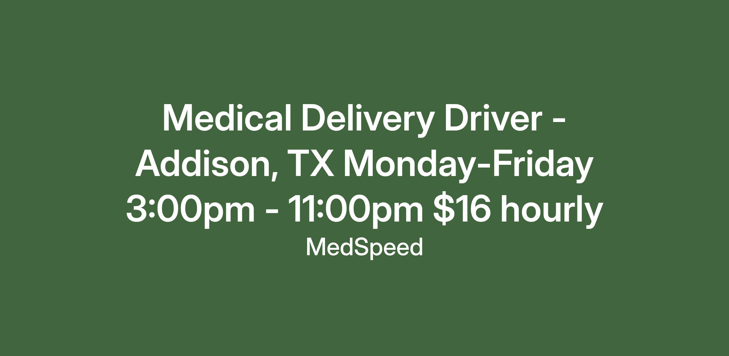 Medical Delivery Driver - Addison, TX Monday-Friday 3:00pm - 11:00pm $16 hourly